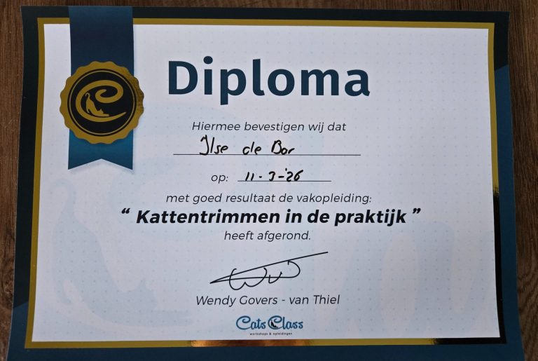 Op 11 maart 2026 had ik mijn laatste praktijkdag voor het katten trimmen. Deze heb ik gelukkig positief afgerond! Mocht je een kat hebben die nodig een trimbeurt nodig heeft, stuur dan vooral een berichtje!